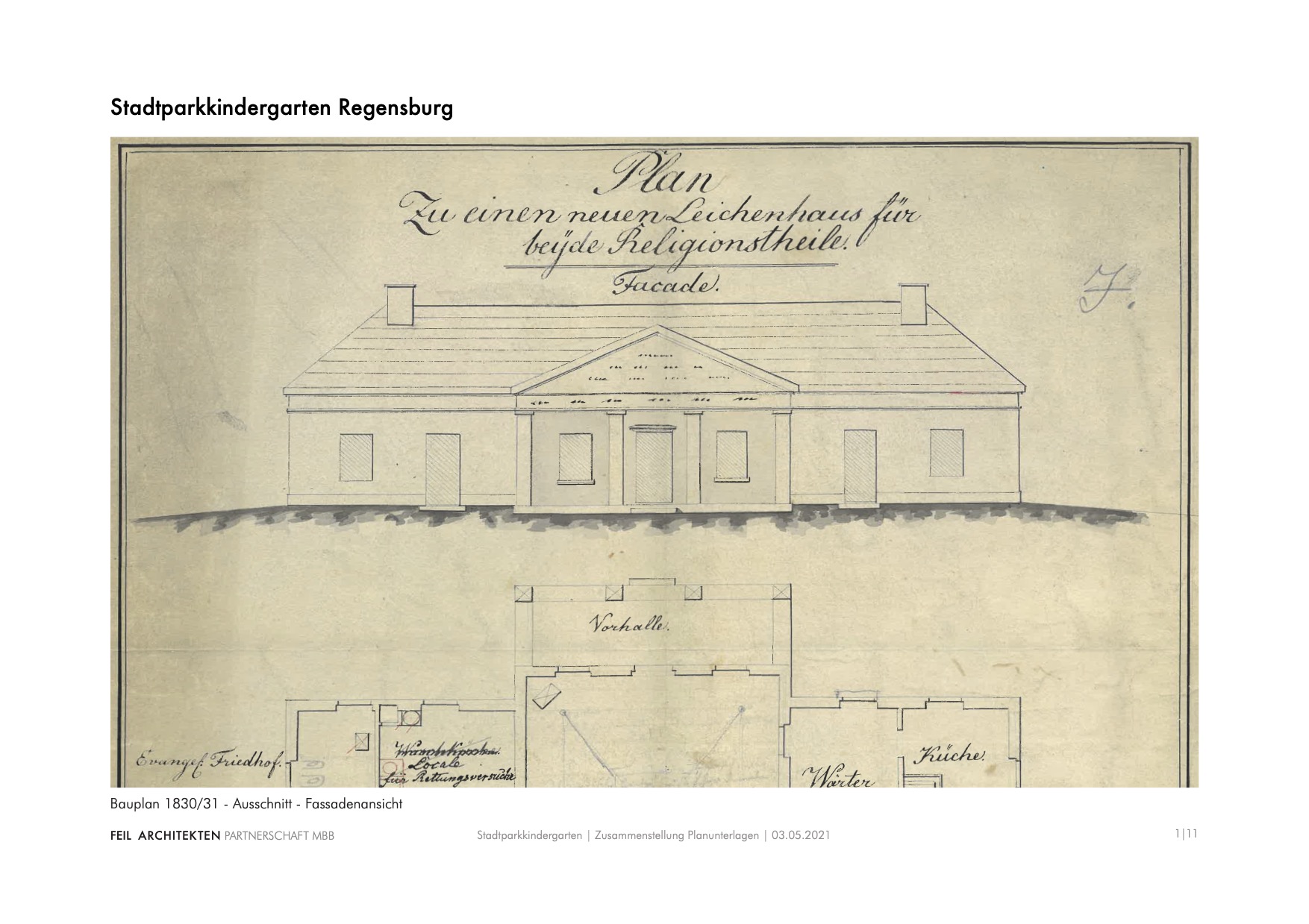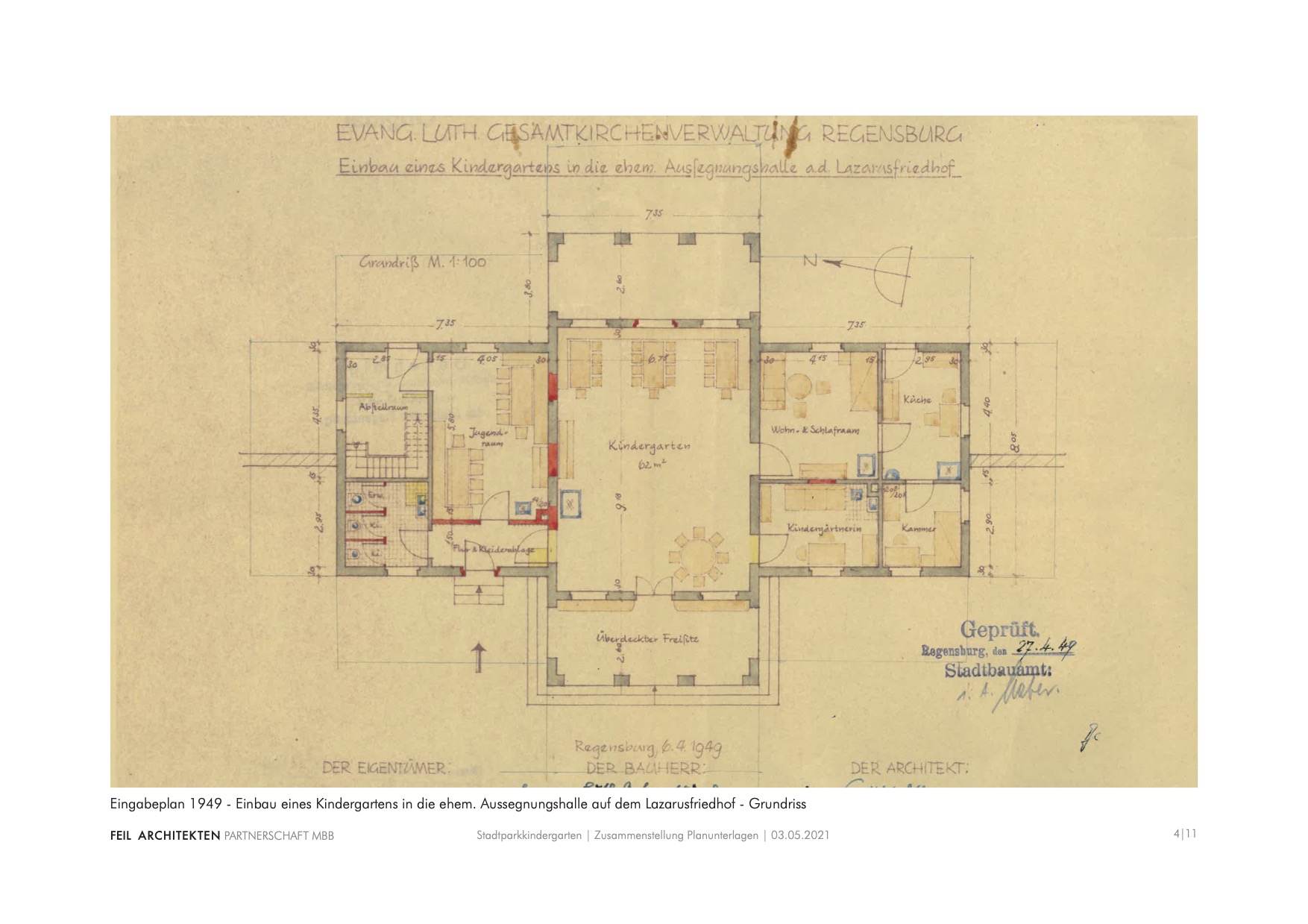 Das Gebäude des Kindergartens ist die ehemalige Friedhofshalle des Lazarusfriedhofs, die 1831 zwischen dem katholischem und dem evangelischen Teil des Friedhofs errichtet wurde und beiden Friedhofsteilen als Begräbnisstätte diente. Nach der Auflassung der Friedhöfe 1899 bzw. 1908 wurde das Gebäude umgenutzt, so war u.a. zwischenzeitlich dort ein Tanzlokal untergebracht. 1974 bezog dann der Kindergarten im Stadtpark der Regensburger Eltern e.V. die Räumlichkeiten und nutzt sie bis heute. Das Gebäude ist in die Denkmalliste eingetragen.