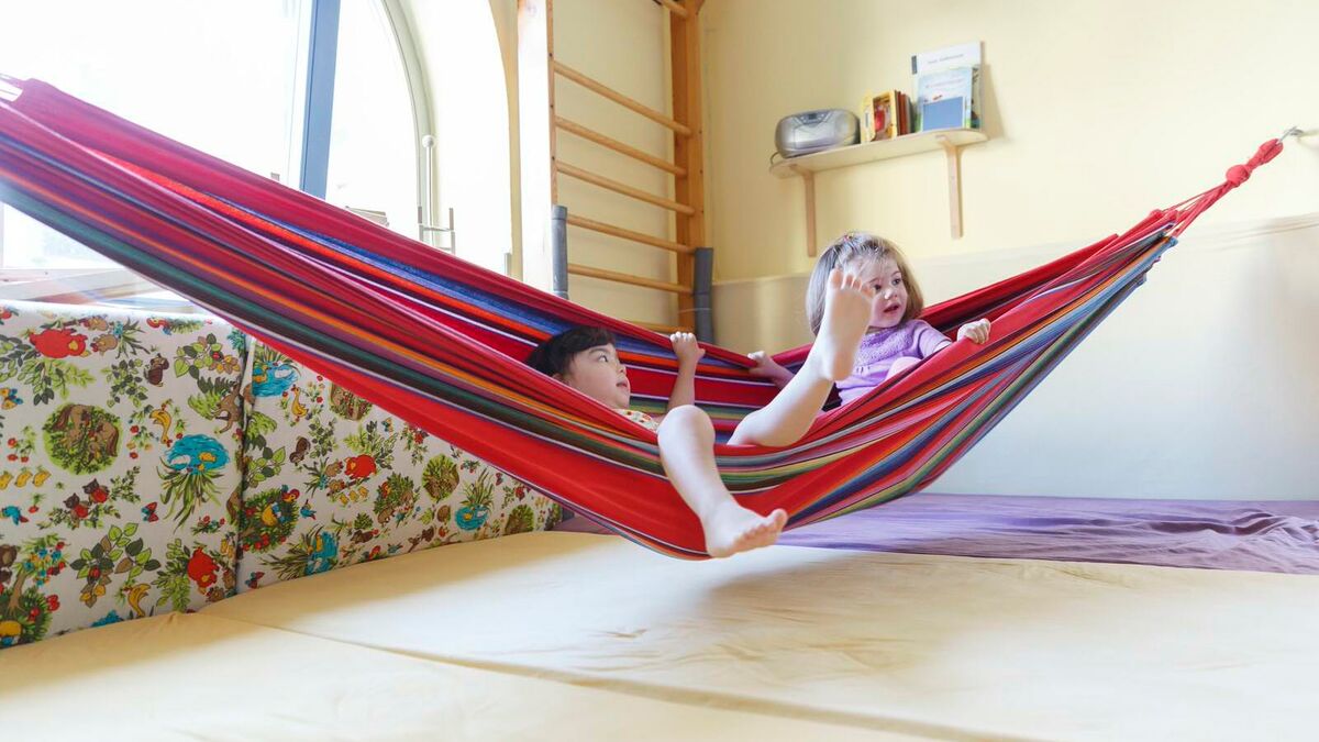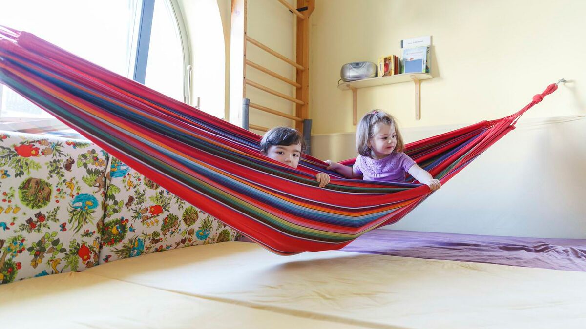 - ein freundlicher Gruppenraum, in dem sich der Großteil des Tagesgeschehens abspielt. Er ist kindgerecht eingerichtet und verfügt über eine Sprossenwand, viele Matratzen zum Bewegen und Kuscheln, Rückzugsräume, eine Hängematte und eine abgetrennte, ruhige Essecke. Der Raum bietet vielfältige Möglichkeiten für Bewegung, Spiel und Rückzug, sowie für die unterschiedlichsten pädagogischen Handlungseinheiten.