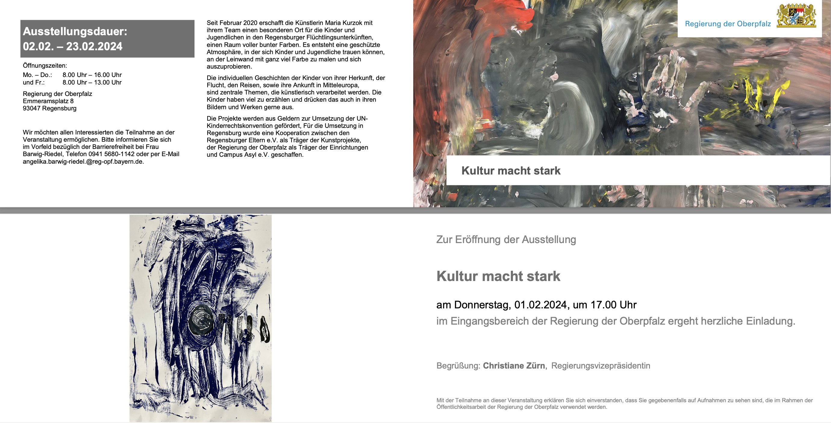 Unser Kunstprojekte mit und für die Kinder in den Geflüchteteneinrichtungen wurde am 01. Dezember 2022 im Museumspädagogisches Zentrum in München, gemeinsam mit 5 weiteren "Kultur macht stark" Projekten aus Bayern vorgestellt. Es ist für uns eine ganz besondere Auszeichnung aus insgesamt 1402 unterschiedlichen Einzelprojekten ausgewählt worden zu sein. Ganz besonders wurde gewürdigt, dass die Regierung der Oberpfalz, neben dem sehr engagierten campus asyl e.V., unser Kooperationspartner ist!