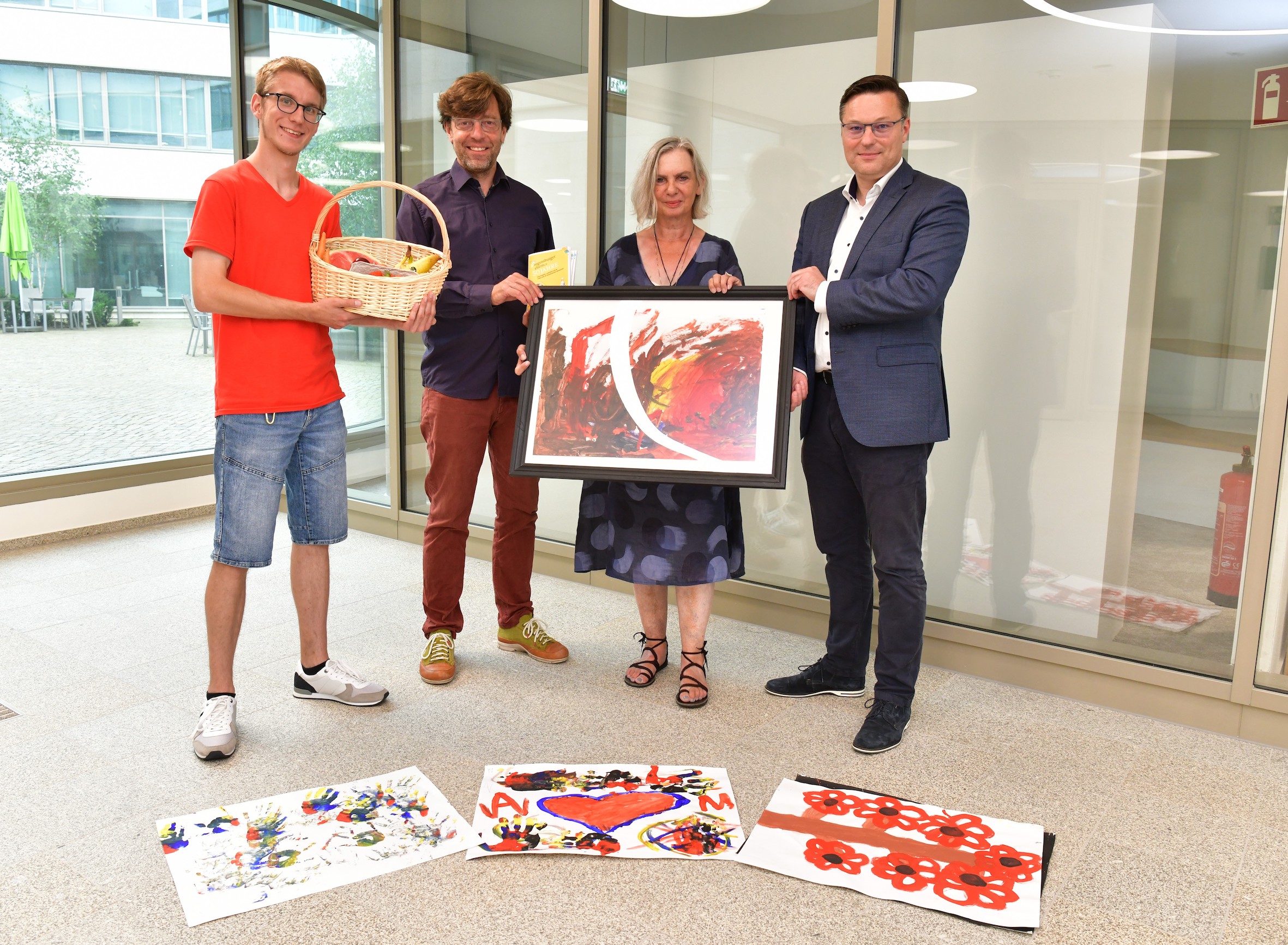 Von Links: Sebastian Lengfelder, Leiter der Caritas-Kinderbetreuung im Ankerzentrum; Michael Straube, Vorstand der Regensburger Eltern; Künstlerin Maria Kurzok und REWAG-Vorstand Bernhard Büllmann bei der Spendenübergabe im R-Werk.