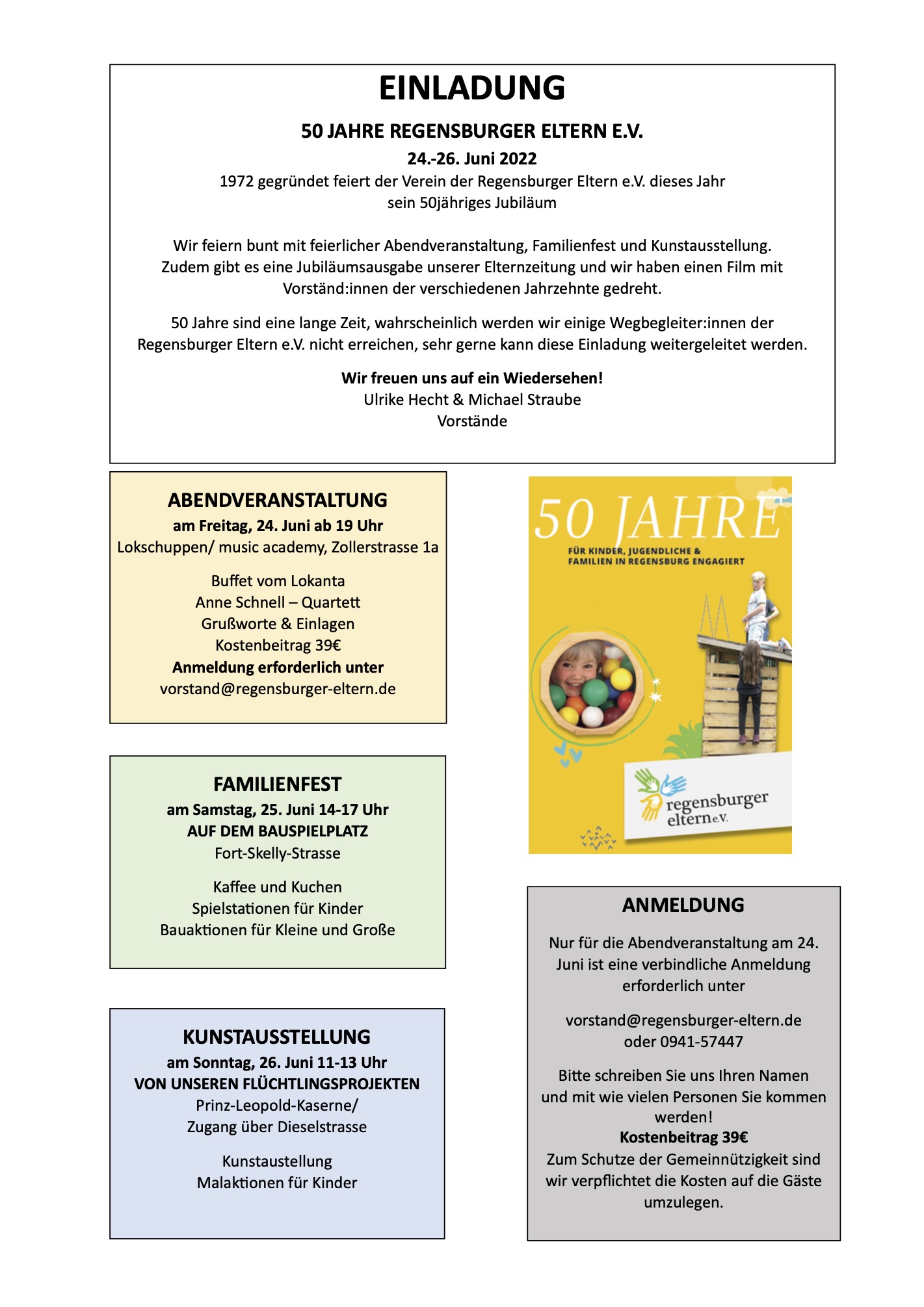 Noch eine Bitte: Nach fünf Jahrzehnten kann es sein, dass wir die eine oder andere Person, die sich dem Verein verbunden fühlt, nicht mehr erreichen. Diese Einladung kann gerne weitergeleitet werden, wir freuen uns über jeden Wegbegleiter der Regensburger Eltern e.V., der mit uns feiern möchte!
