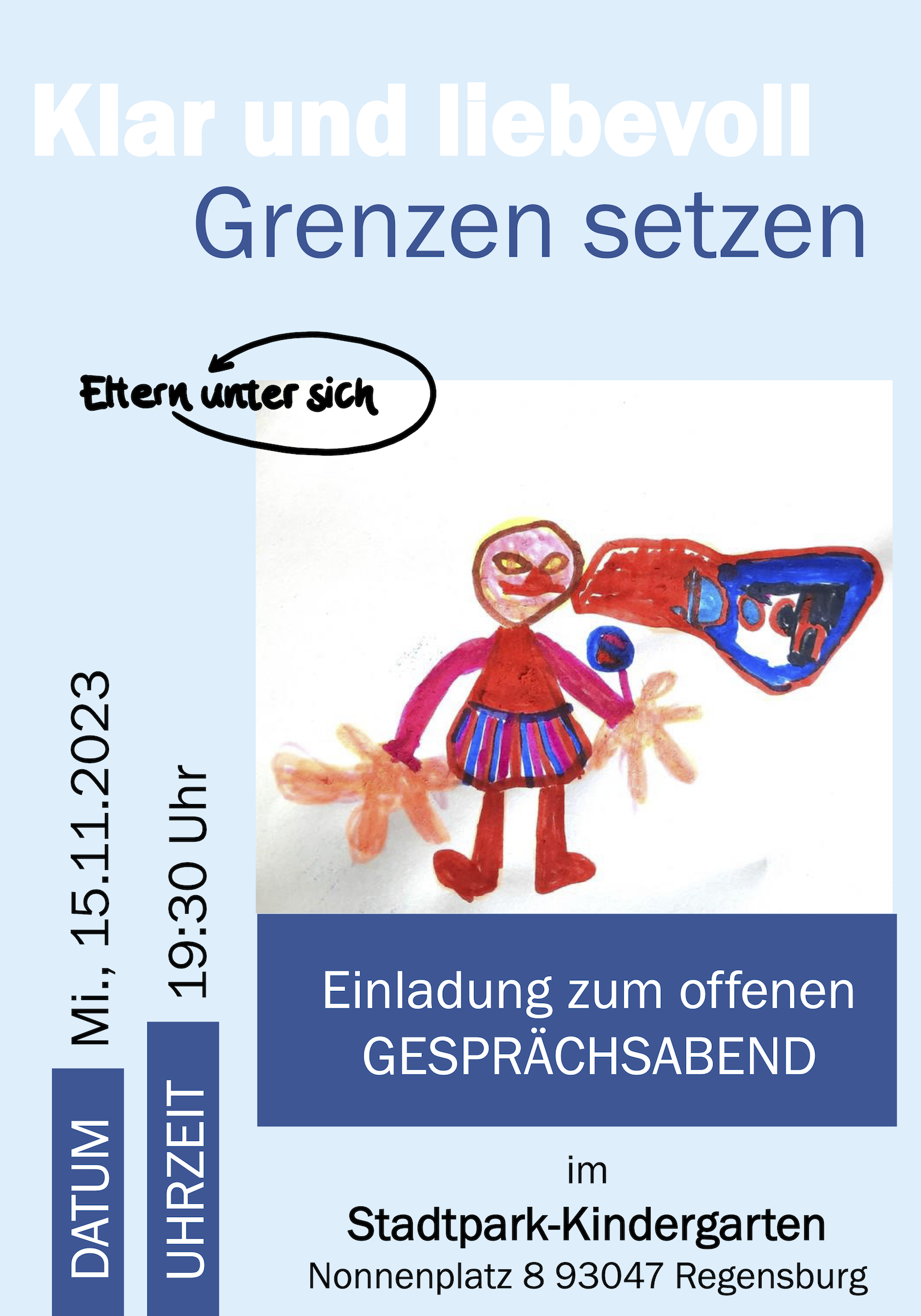 Wir sind gespannt auf den gemeinsamen Abend und laden alle Eltern – ganz besonders auch die Väter – wieder sehr herzlich in den Stadtpark- Kindergarten ein!